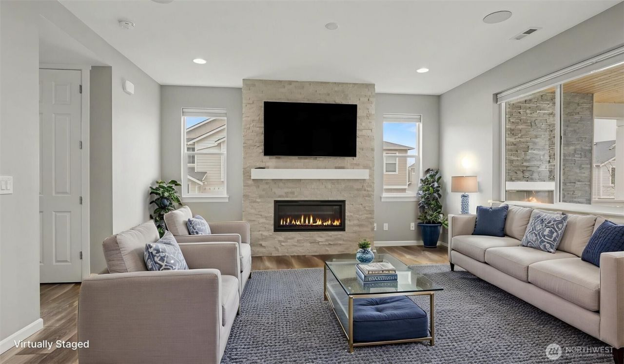 Welcome to this stunning 4 bedroom Richmond American home, ideally situated on a premium lot in a quiet Renton community - offering rare privacy, Mt. Rainier views, and luxury upgrades throughout. Step inside to high end flooring, designer fixtures, and an open-concept layout perfect for modern living. The chef's kitchen boasts quartz counters, custom soft-close cabinetry, Carrara marble backsplash, GE Cafe appliances, double ovens, a 5 burner cooktop, and a floor-to-ceiling pantry, flowing seamlessly into the spacious living room with a stone gas fireplace and whole home audio. Upstairs, the primary suite is a true retreat featuring a spa-inspired custom tile shower, and a beautifully designed walk in closet with illuminated builtins. 4 true bedrooms. Comfort is elevated with a high efficiency furnace, 15 SEER AC, LED lighting, and smart home upgrades including smart switches, WiFi garage door, soffit wired holiday lights, finished garage and EV charger plug. Outdoor living shines with an extended covered patio featuring a stacked stone gas fireplace, natural gas BBQ hookup, pine bead board ceiling, plus a paver patio, fully fenced and irrigated yard, and two storage sheds. Convenient to Soos Creek Trail and major freeways, this home blends privacy, luxury, and effortless living.