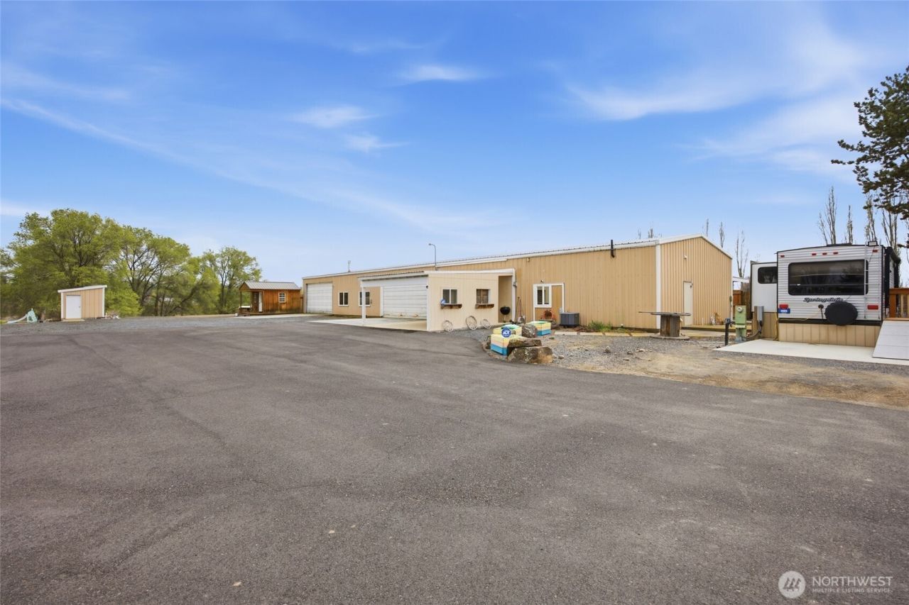 Rare opportunity to own 2 separate parcels (1.49 acres each) totaling 2.98?/- acres with a finished 1,040 sq ft 1-bed barndominium. Second flag lot (separate parcel #) is ready to build. Fully fenced property with private well, mature trees, landscaping, and large covered front patio for year-round enjoyment. The 32x110 shop features 3 overhead doors, central heat/AC, and Generac backup generator. Full RV hookups with concrete pad. Detached shed with mini-split offers flexible use. ADA-compliant design with zero-step entry to all water areas and doorways. Remodeled kitchen with hickory cabinets, quartz counters, and stainless appliances. Vaulted ceilings in living/kitchen and LVP flooring throughout. Versatile property with privacy, functionality, and future potential.